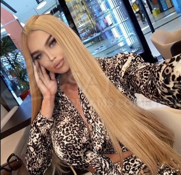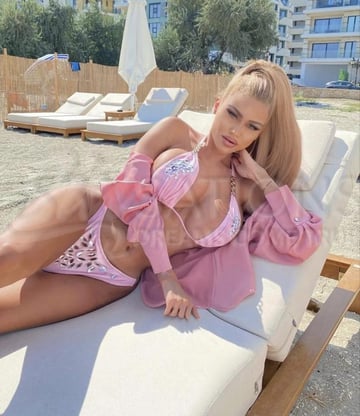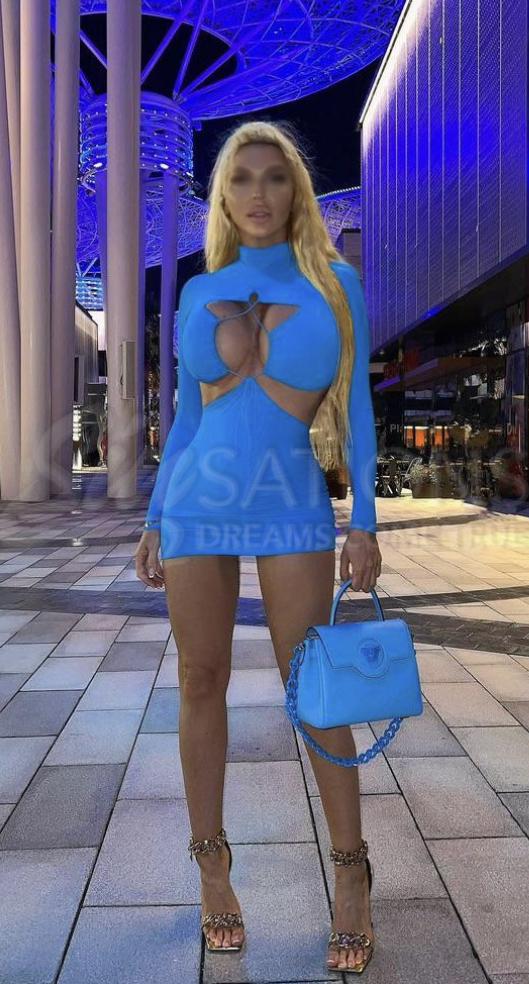 is a 5'7, slender, caucasian woman with blonde hair and blue eyes. Available for men, women, couples.