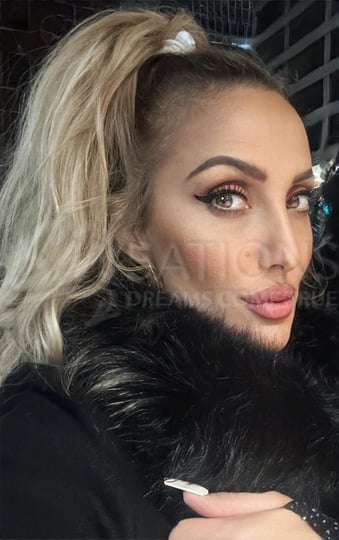 is a 5'5, average, woman with blonde hair and hazel eyes. Available for men, groups, couples.